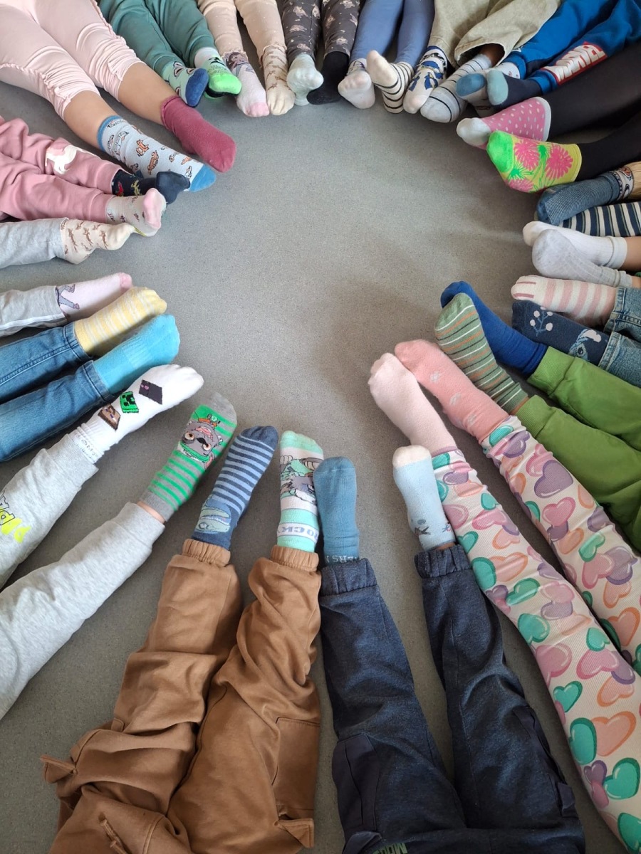 Przedszkole Tęcza obchodziło Światowy Dzień Zespołu Downa w wyjątkowo kolorowy sposób – dzieci przyszły ubrane w różnorodne, nie do pary skarpetki, symbolizujące akceptację i różnorodność. Tego dnia uczestniczyły również w teatrzyku pt. „Księga marzeń”, który w piękny sposób ukazał wartości takie jak empatia, zrozumienie i szacunek dla innych. Całe przedszkole wypełniło się barwami dzięki skarpetkowym pracom plastycznym, tworząc radosną i pełną życzliwości atmosferę.
